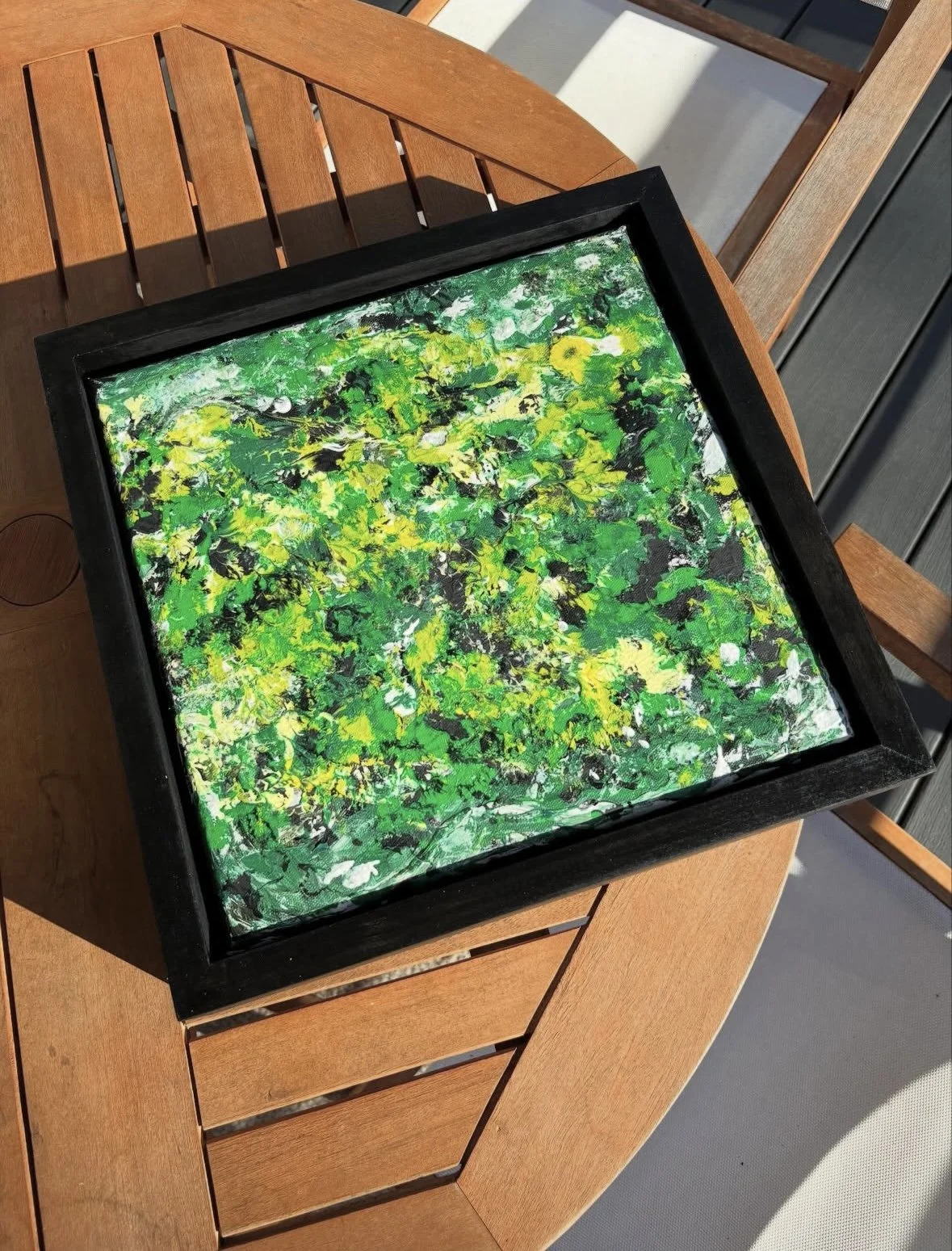 Title: Meadow || Colors: green, black, and white || Frame: Black stain